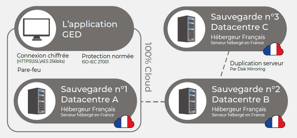 La solution est hébergée en France, par un hébergeur français, sur 3 Datacenters situés à Gravelines, Roubaix et Strasbourg. Toutes les données sont stockées sur une plateforme entièrement sécurisée.